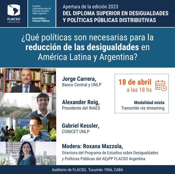 El Diploma Superior en Desigualdades y políticas públicas distributivas del Área Estado y Políticas Públicas invita a la comunidad académica a participar de la jornada de apertura de la edición de este año de la propuesta académica. El evento, titulado “¿Qué políticas son necesarias para la reducción de las desigualdades en América Latina y Argentina?”, se llevará a cabo el martes 18 de abril a las 18 hs en el auditorio de la FLACSO Argentina y contará con transmisión por Zoom y YouTube.