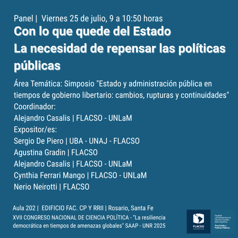 El Área Estado y Políticas Públicas de FLACSO Argentina estará presente en el XVII Congreso Nacional del Ciencia Política que se realizará del 23 al 26 de julio 2025 en la Facultad de Ciencia Política y Relaciones Internacionales de la Universidad Nacional de Rosario.