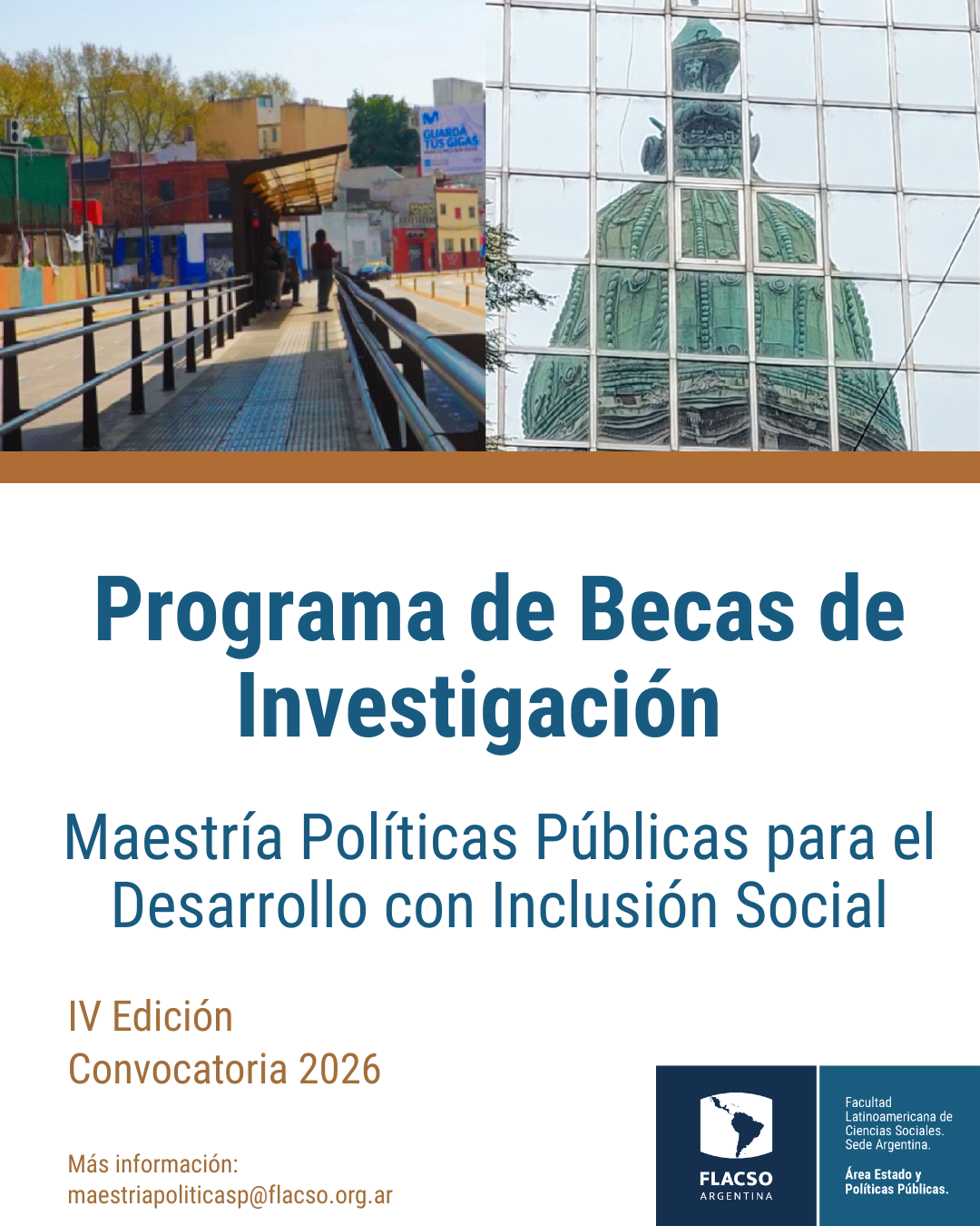 El Área de Estado y Políticas Públicas de la FLACSO Argentina abre la convocatoria a la IV Edición – Convocatoria 2026 del programa de Becas de Investigación para realizar estudios de posgrado en la Maestría en Políticas Públicas para el Desarrollo con Inclusión Social (Categoría A otorgada por la CONEAU – RESFC-2023-521-APN-CONEAU#ME) .