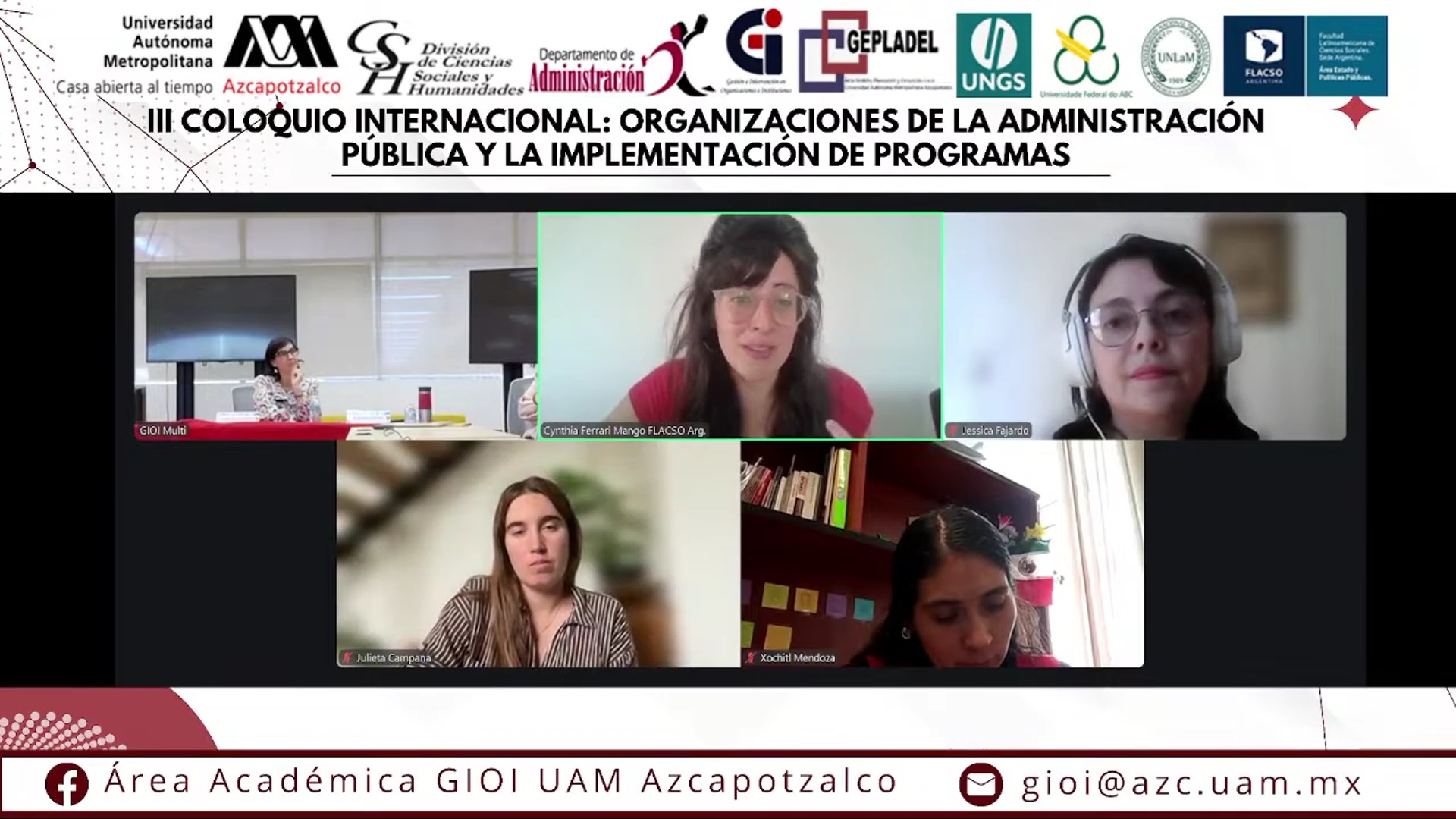 El 10 y 11 marzo de 2026 se llevó a cabo el III Coloquio Internacional: ORGANIZACIONES DE LA ADMINISTRACIÓN PÚBLICA Y LA IMPLEMENTACIÓN DE PROGRAMAS. Miradas diversas hacia lo local y a las condiciones sociales en Argentina, Brasil y México impulsado por la Universidad Autónoma Metropolitana de México, Área Académica de Gestión e Intervención en Organizaciones e Instituciones del Departamento de Administración. Del mismo participarán investigadores/as del Área Estado y Políticas Públicas de la FLACSO – Sede Argentina.